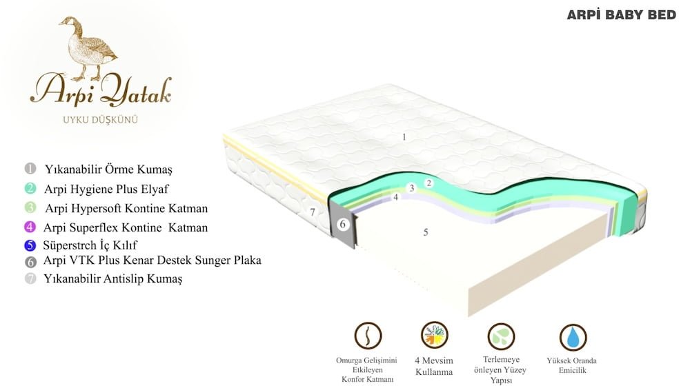 Arpi Baby Bed Çocuk Yatağı, bebeğinizin uyku kalitesini ve omurga sağlığını en üst düzeye çıkarmak için özenle tasarlanmıştır. Doğal malzemeler ve çift taraflı kullanımıyla 0-6 yaş arası çocuklar için ideal bir uyku çözümüdür.